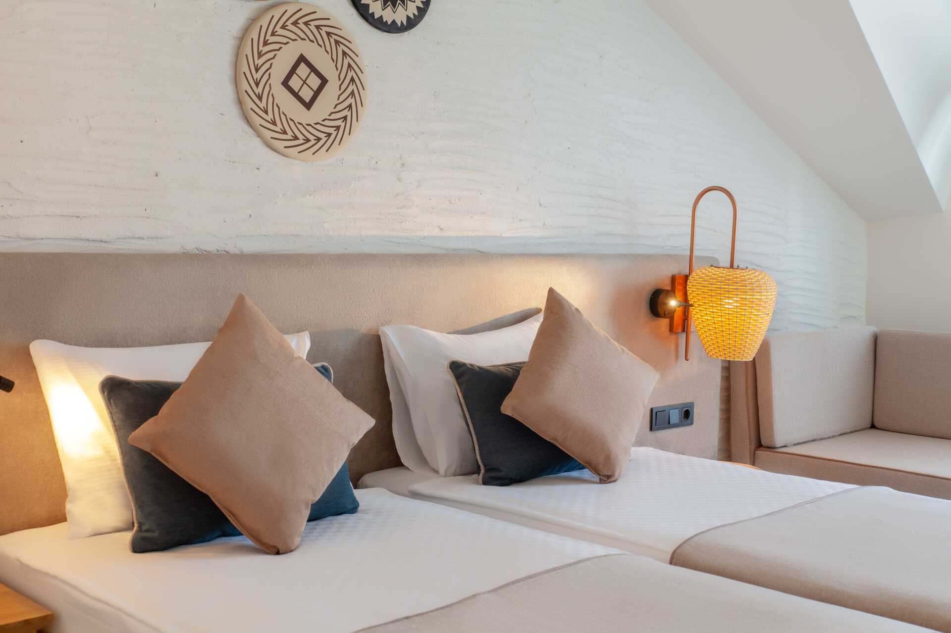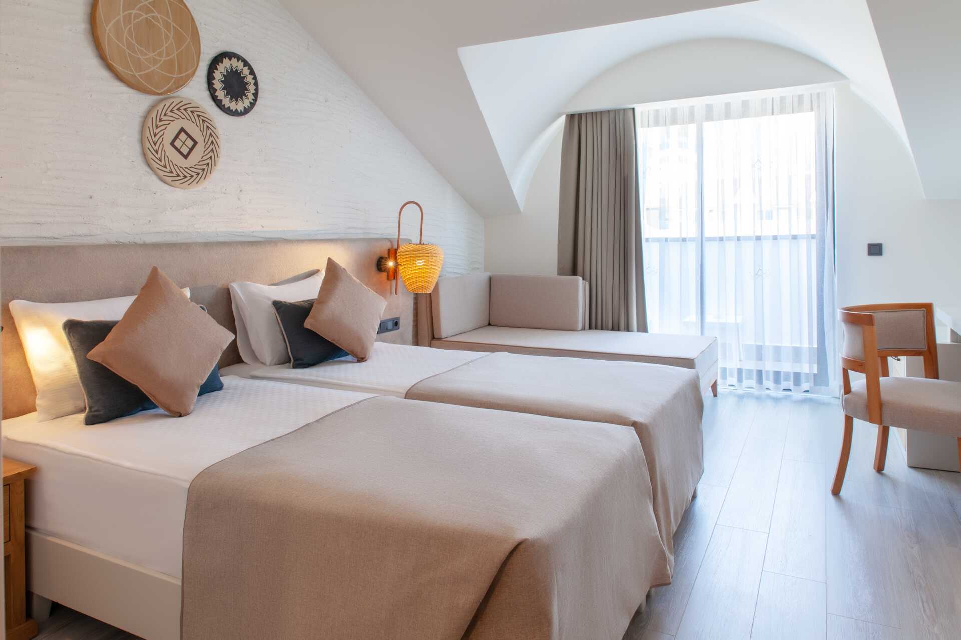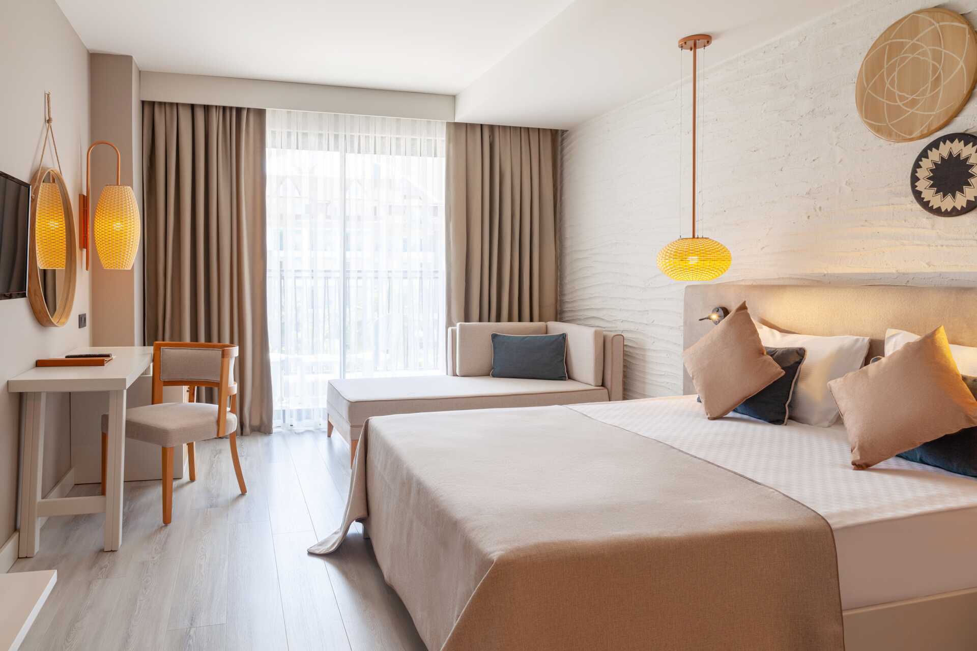 Perhehuoneessa parveke. Perhehuone koostuu kahdesta makuuhuoneesta, jotka on yhdistetty väliovella. Makuuhuoneessa parivuode tai kaksi erillistä sänkyä. Lisävuodemahdollisuus toisessa makuuhuoneessa. Maksuton wifi, ilmastointi ja tallelokero. Minibaari maksuton. Vedenkeitin, kahvia ja teetä. Tv kansainvälisillä kanavilla. Hiustenkuivain. Kylpyhuoneessa suihku ja wc. Siivous 7 krt/viikko.