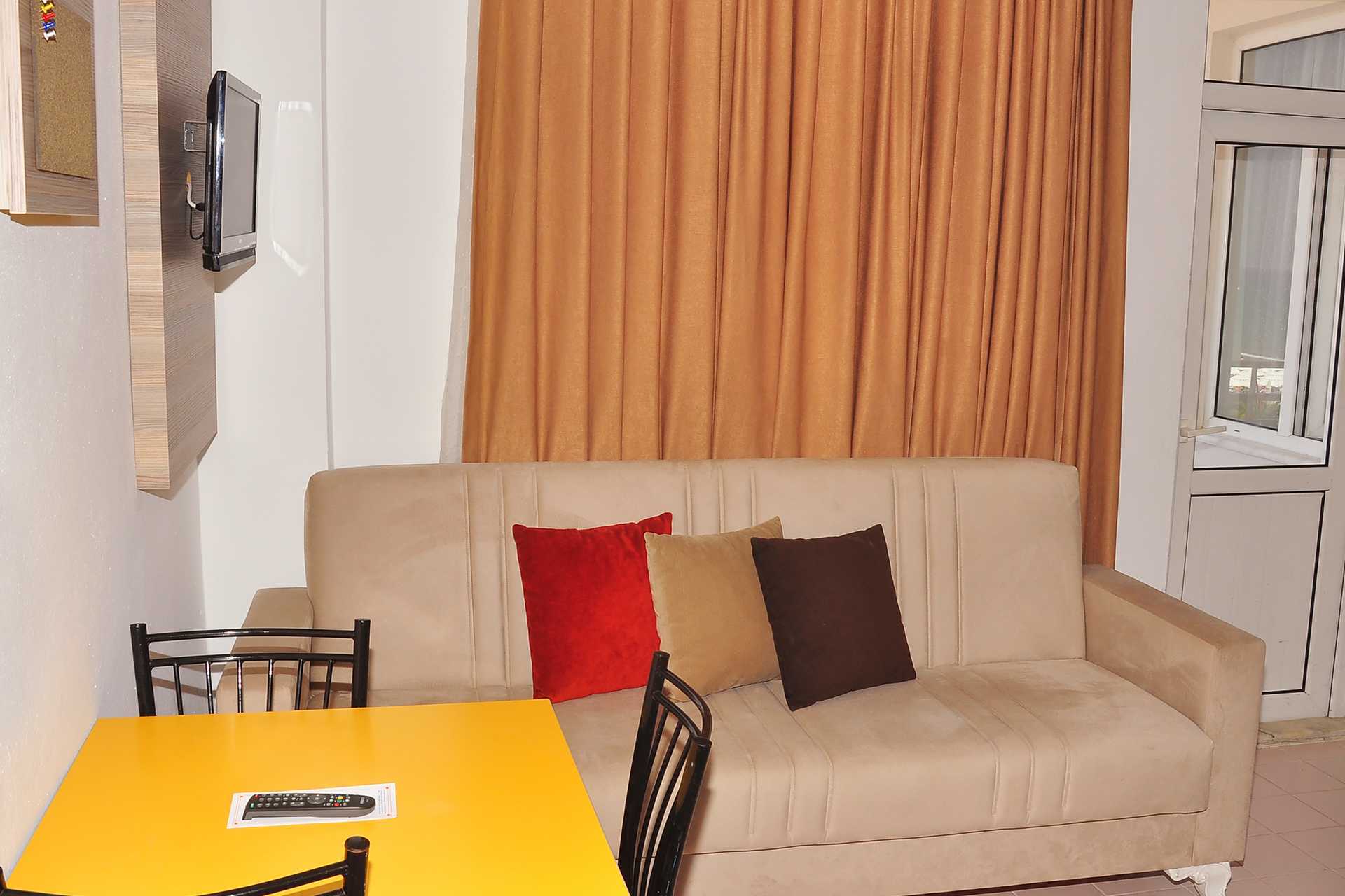 Kaksio parvekkeella. Makuuhuone sekä yhdistetty olohuone ja minikeittiö. Parivuode tai kaksi yhden hengen sänkyä. Mahdollisuus lisävuoteisiin kahdessa muuntuvassa nojatuolissa. Minikeittiössä on keittolevyt, jääkaappi ja yksinkertainen keittiövarustus. Ilmastointi lisämaksusta. Joissakin huoneistoissa on ilmastointi makuuhuoneessa, kun taas toisissa se on vain olohuoneessa. Hiustenkuivain. Suihku ja wc. Siivous 7 krt/viikko.