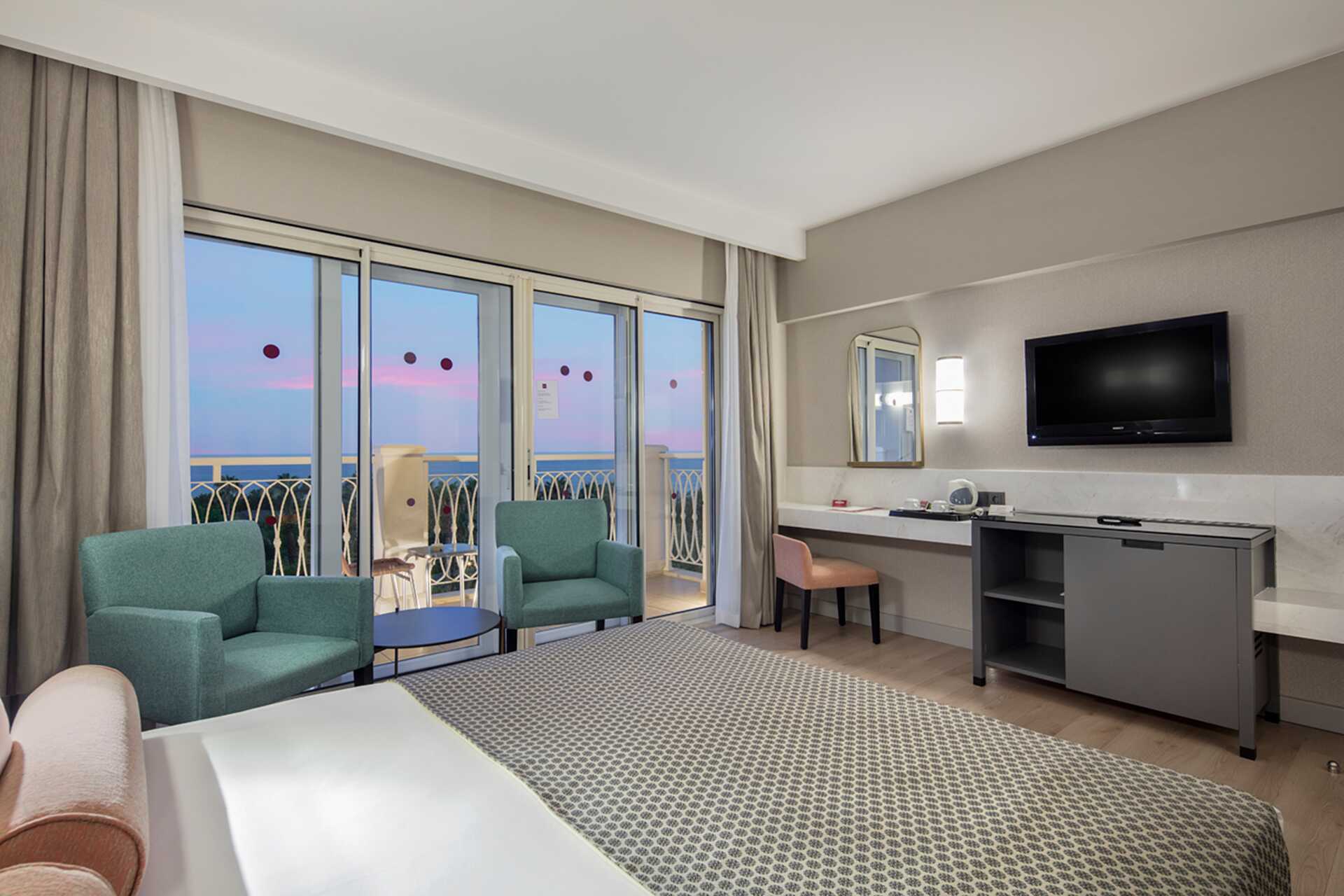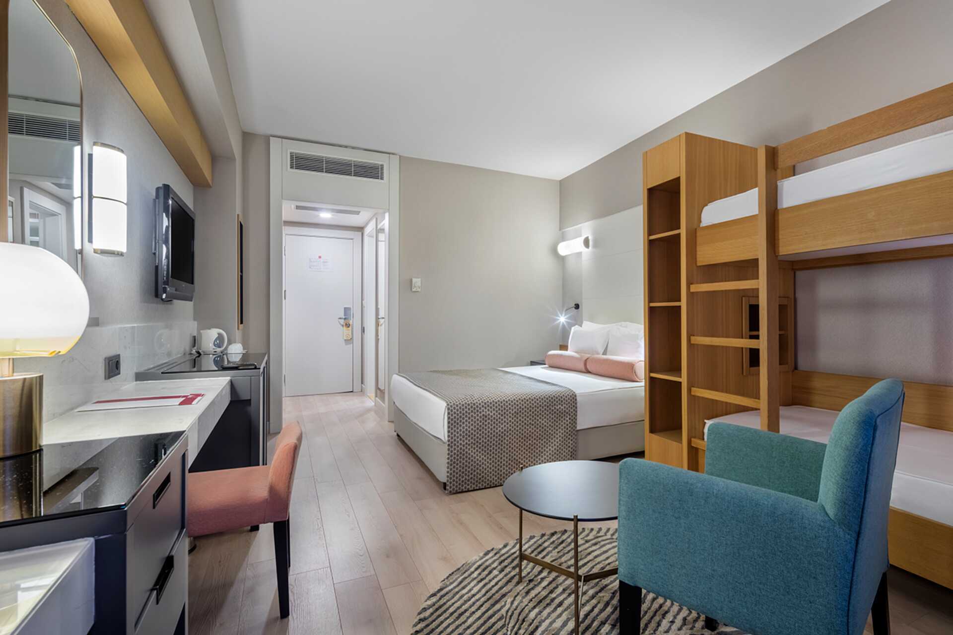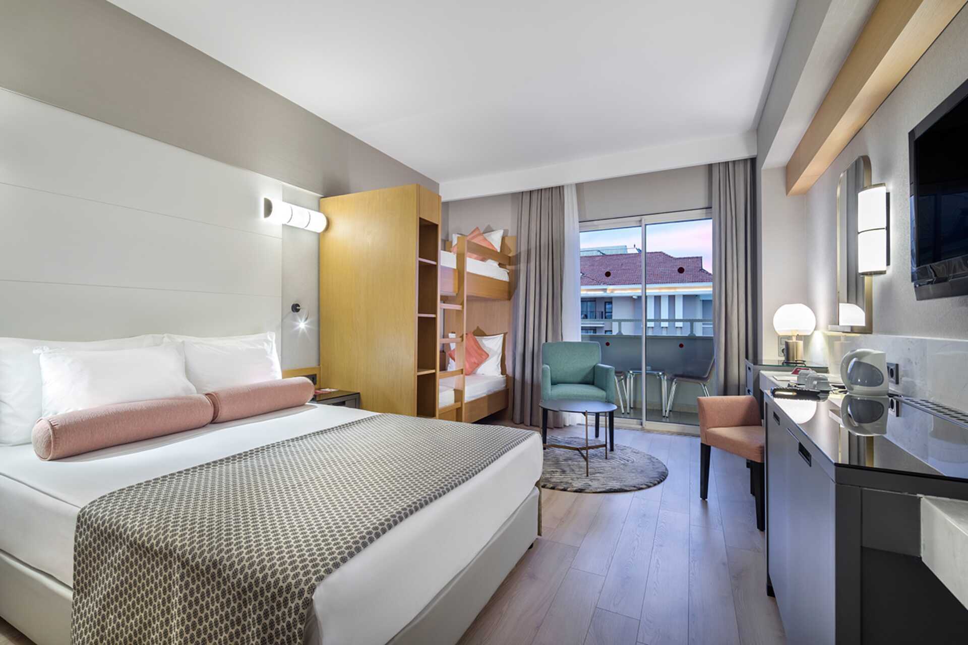 Perhehuone parvekkeella, osassa merinäköala tai rajoitettu merinäköala. Perhehuoneita on saatavilla kahtena versiona: toisessa on kaksi makuuhuonetta (noin 32 neliömetriä), joissa kummassakin on parivuode tai kaksi erillistä sänkyä, tai toisessa on parivuode ja mahdollisuus lisävuoteeseen kerrossängyssä kahdelle lapselle (noin 24 neliömetriä). Maksuton wifi, ilmastointi ja tallelokero. Minibaari sisältää virvoitusjuomia, olutta ja vettä, ja sitä täydennetään päivittäin. Vedenkeitin, kahvia ja teetä. Tv kansainvälisillä kanavilla. Kylpytakit ja tossut. Hiustenkuivain. Kylpyhuoneessa suihku ja wc. Siivous 7 krt/viikko.