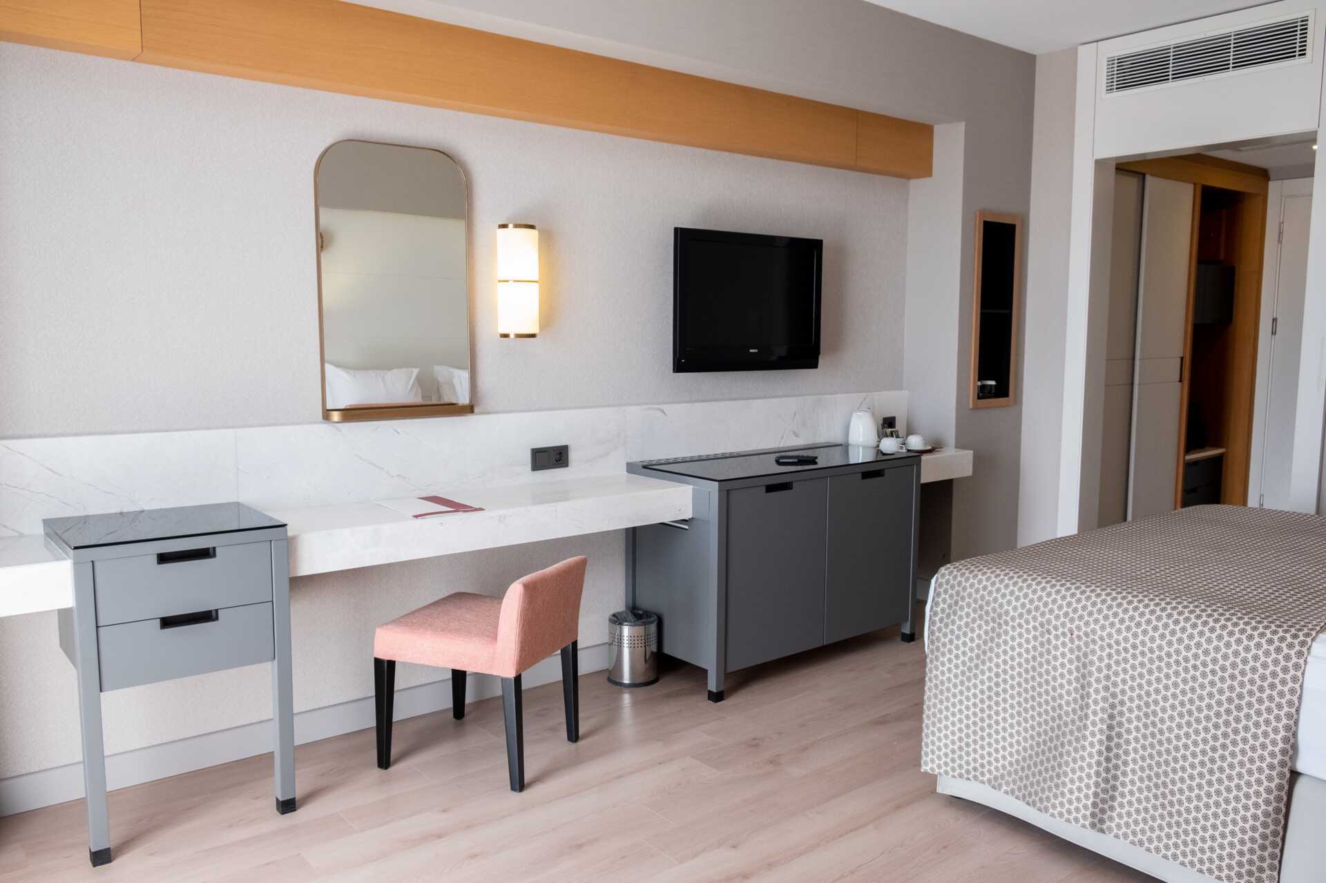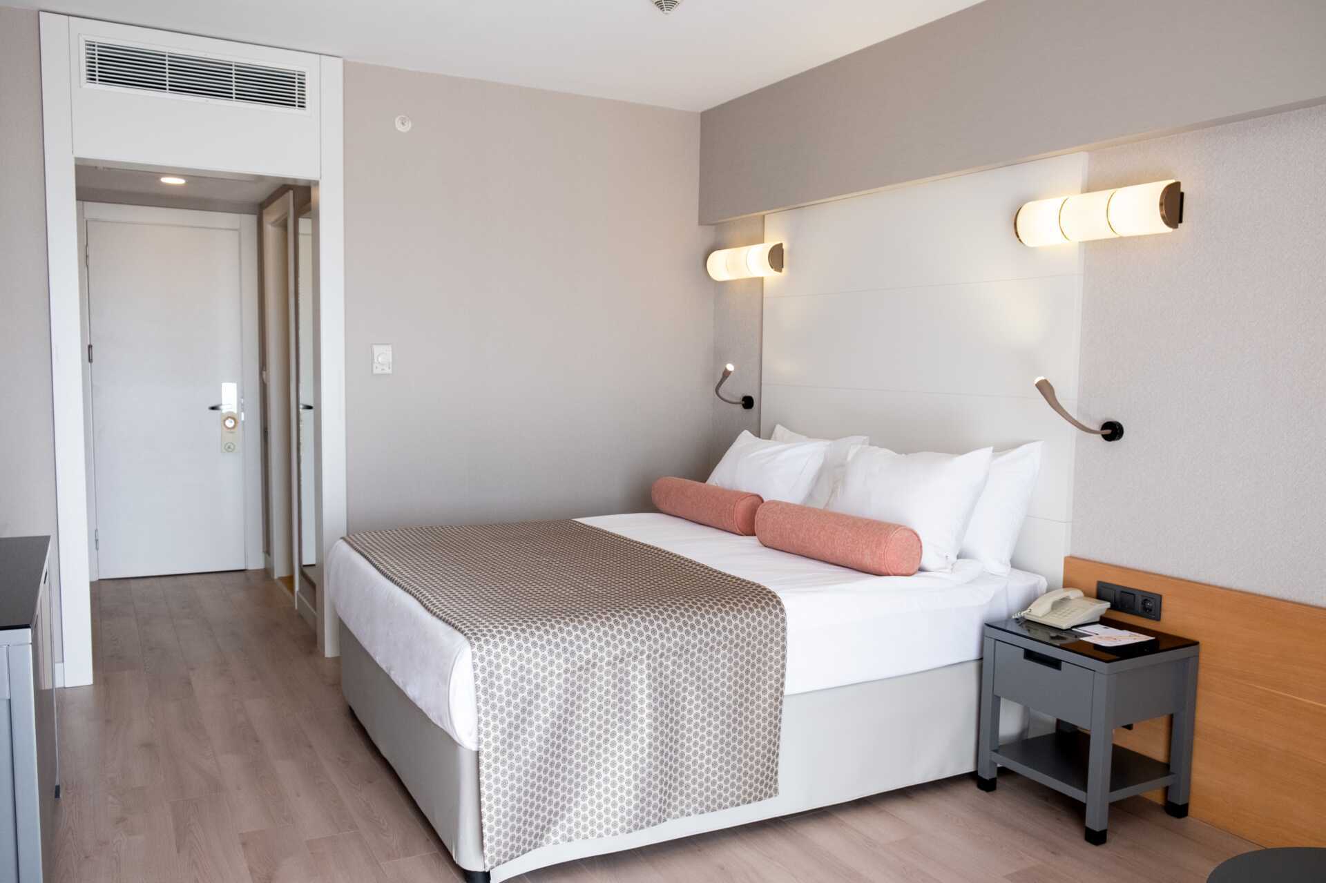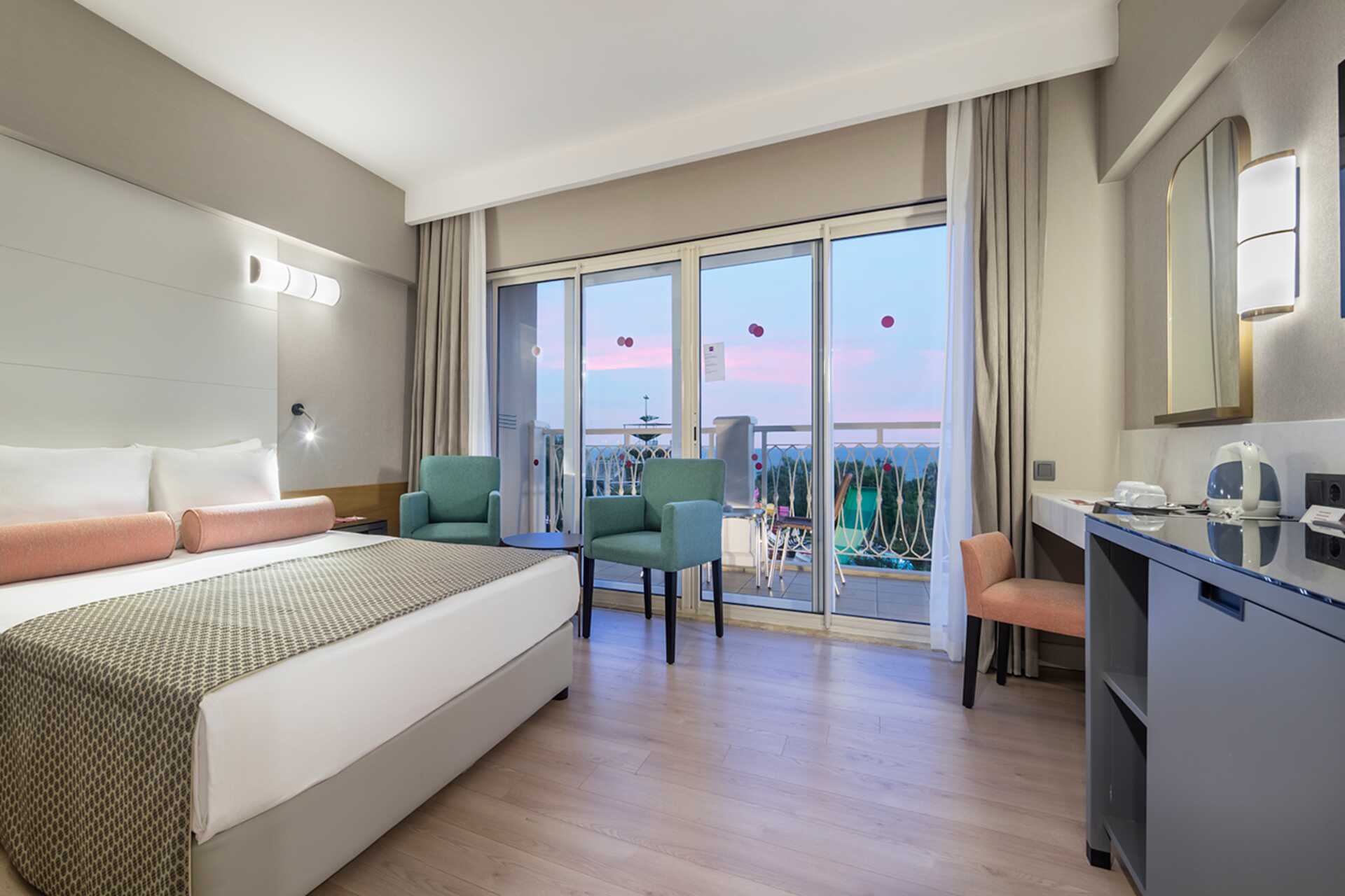 Perhehuone parvekkeella, osassa merinäköala tai rajoitettu merinäköala. Perhehuoneita on saatavilla kahtena versiona: toisessa on kaksi makuuhuonetta (noin 32 neliömetriä), joissa kummassakin on parivuode tai kaksi erillistä sänkyä, tai toisessa on parivuode ja mahdollisuus lisävuoteeseen kerrossängyssä kahdelle lapselle (noin 24 neliömetriä). Maksuton wifi, ilmastointi ja tallelokero. Minibaari sisältää virvoitusjuomia, olutta ja vettä, ja sitä täydennetään päivittäin. Vedenkeitin, kahvia ja teetä. Tv kansainvälisillä kanavilla. Kylpytakit ja tossut. Hiustenkuivain. Kylpyhuoneessa suihku ja wc. Siivous 7 krt/viikko.